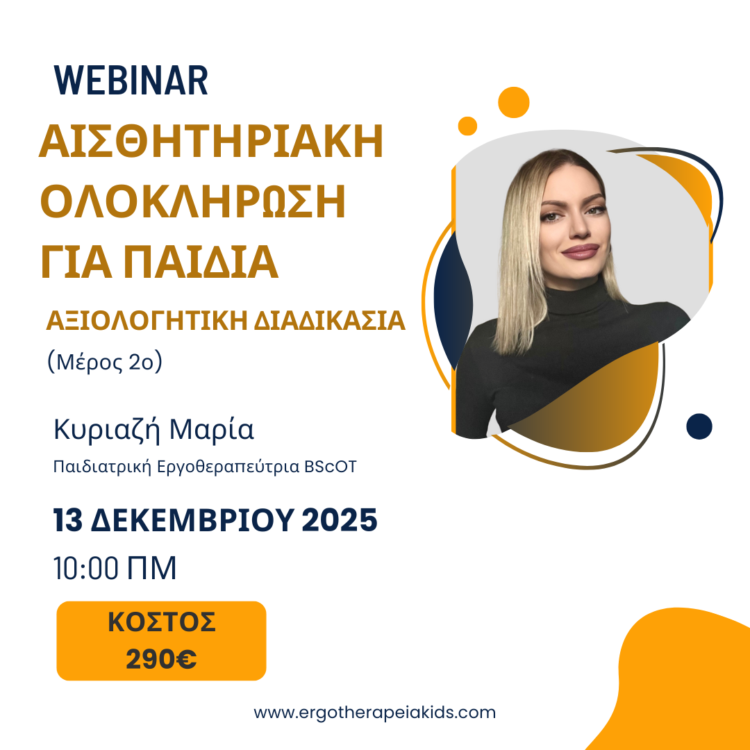 Το Ergotherapeia Kids διοργανώνει το σεμινάριο «Αισθητηριακή Ολοκλήρωση για Παιδιά- Μέρος 2ο (Αξιολογητική Διαδικασία)». Η αισθητηριακή ολοκλήρωση αποτελεί ουσιώδη βάση για την μάθηση και την προσαρμοστική συμπεριφορά και στα παιδιά ο ρόλος της είναι ζωτικής σημασίας για την ανάπτυξη τους.